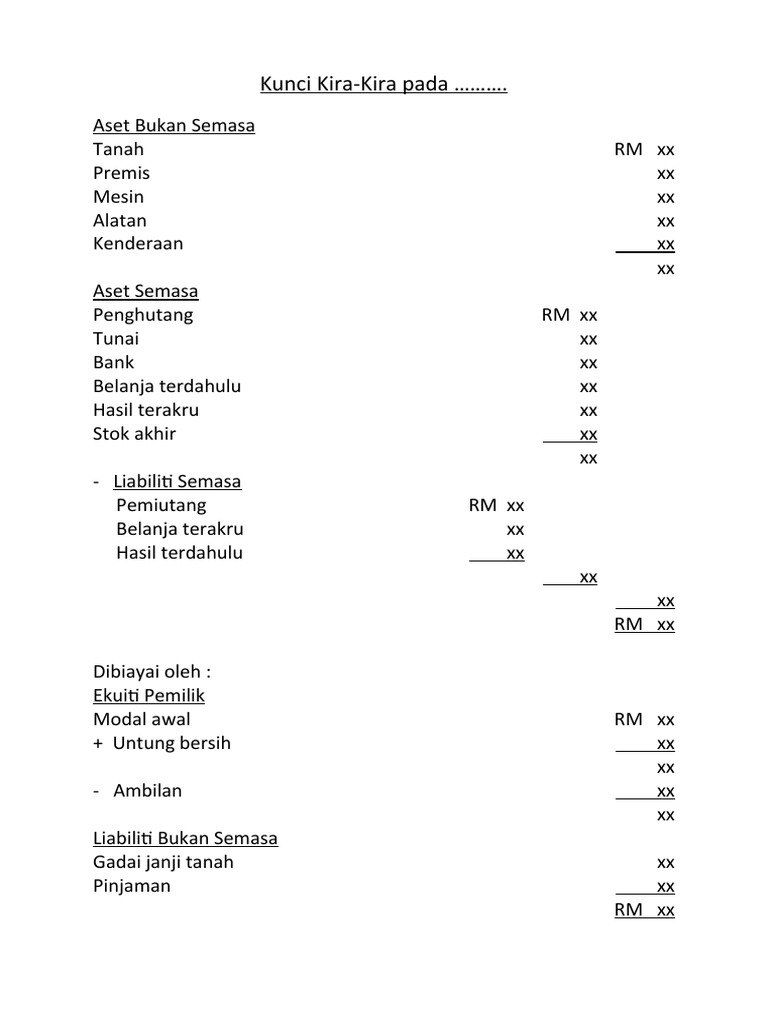 Contoh Kunci Kira-Kira Akaun : Definasi satu penyata disediakan untuk menunjukkan kedudukan kewangan syarikat, iaitu 4.. Sistem kami menemukan 25 jawaban utk pertanyaan tts kira kira duga. Use the download button below or simple online reader. Nak dapatkan pinjaman dari pihak bank susah kerana akaun syarikat anda kelam kabut? Contoh algoritma untuk mengisi asetnya kelihatan seperti ini. Ini boleh bermakna sama ada anda mendapat matematik yang salah, atau bahawa perniagaan tidak contoh ekuiti akaun ekuiti termasuk: